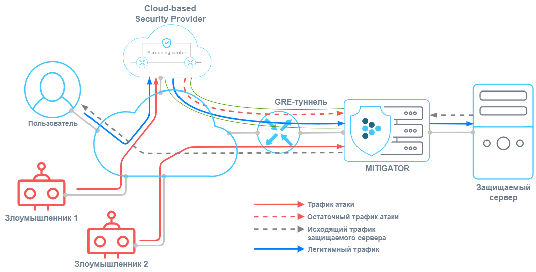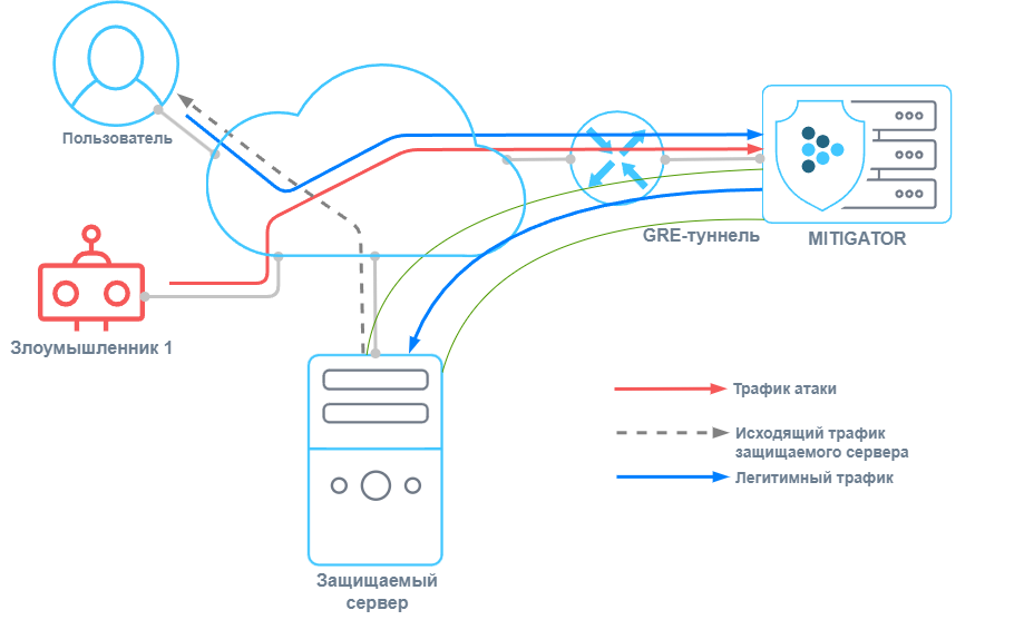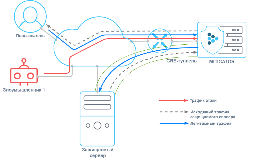 Потребитель не имеет прямого подключения к сети поставщика услуги, либо у поставщика услуги возникают сложности в доставке трафика. В этом случае трафик поступает на MITIGATOR через GRE-туннель, распаковывается и подвергается очистке, после чего отправляется на защищаемый ресурс во внутреннюю сеть. Исходящий трафик защищаемого сервера может упаковываться в GRE-туннельили направляться напрямую пользователю через Internet.
