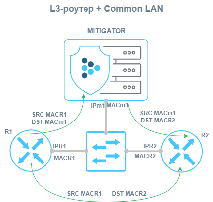 Способ подключения «Common LAN» применяется, когда внешний и внутренний роутеры и экземпляр MITIGATOR находятся в одной L2 и L3 сети. Если принятый с любого физического порта кадр имеет MAC-адрес внешнего роутера, он считается поступившим из внешней сети. MAC-адрес получателя заменяется на MAC-адрес внутреннего роутера, и кадр отправляется через тот же порт. Обратный трафик из внутренней сети может идти через экземпляр MITIGATOR, в этом случае выполняется обратная подстановка MAC-адресов, или следовать напрямую во внешнюю сеть. Поддерживается работа одновременно в нескольких сегментах сети, разделенных при помощи VLAN ID. В этом случае для каждого VLAN ID задаются собственные L3 настройки.