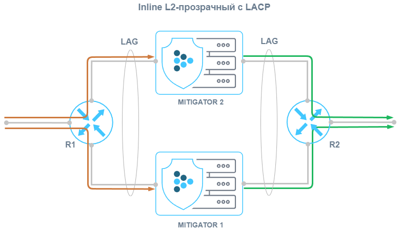 Для способа внедрения Inline L2-прозрачный возможна балансировка трафика между экземплярами MITIGATOR за счет LACP между R1 и R2.