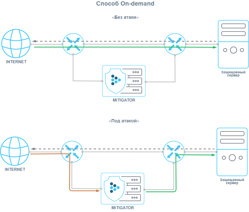 - «On-demand» – трафик из внешней сети направляется на MITIGATOR только по необходимости, например, посредством BGP-анонса с менеджмент-интерфейса MITIGATOR.