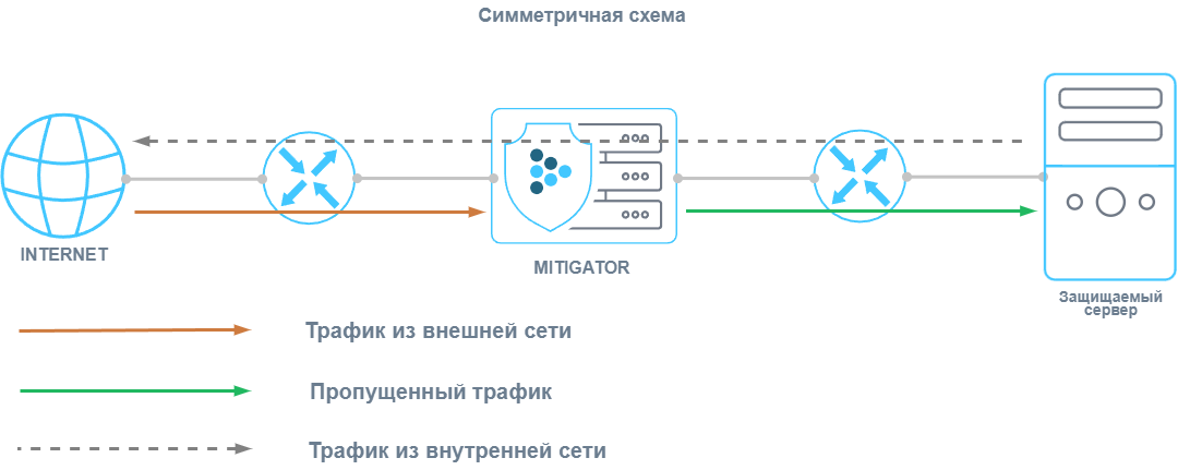 При симметричной схеме внедрения трафик из внешней сети во внутреннюю и обратно проходит через MITIGATOR.