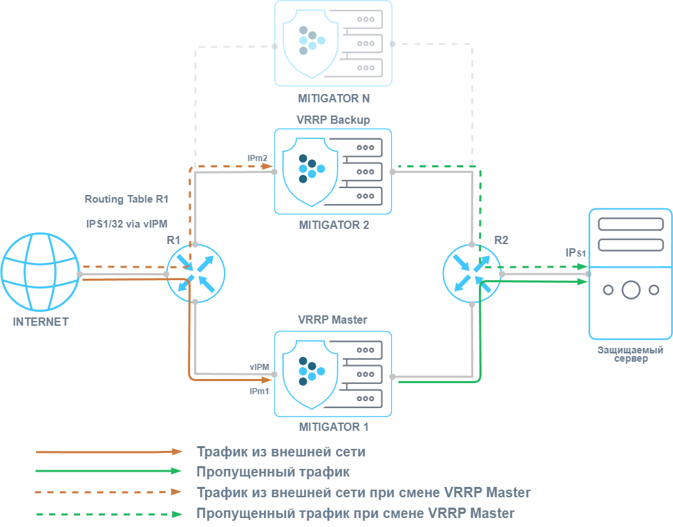 При включении VRRP интерфейсы экземпляров MITIGATOR для внешних устройств представляются одним виртуальным IP-адресом (vIP) и одним виртуальным MAC-адресом (vMAC). При получении ARP-запроса на vIP-адрес VRRP-мастер сообщает сетевому устройству vMAC. Трафик маршрутизируется только на один экземпляр кластера, который в настоящий момент является VRRP-мастером. В случае его отказа статус мастера переходит к другому экземпляру согласно указанным приоритетам. Для внешней и внутренней сетей статусом VRRP-мастера могут обладать разные экземпляры.