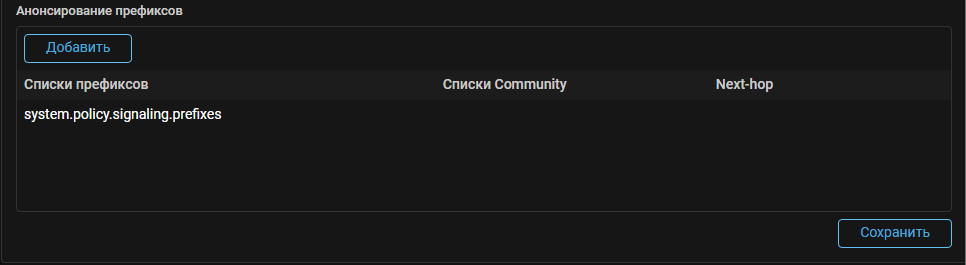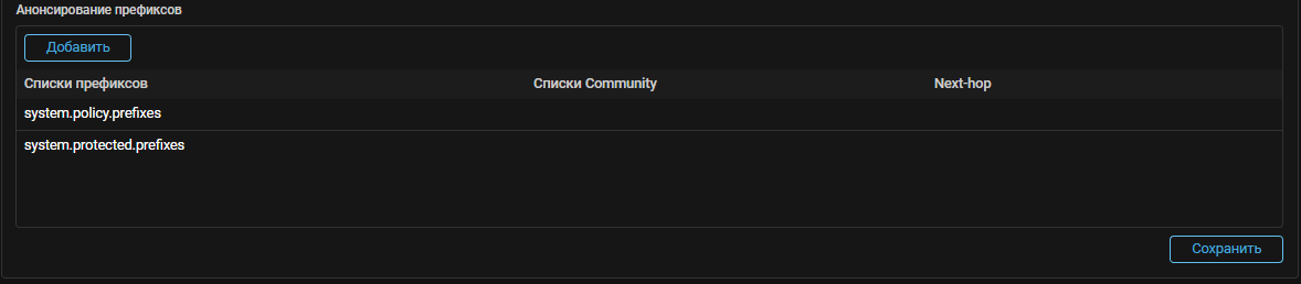 system.protected.prefixes. Он будет автоматически рассылаться всем BGP-соседям, для которых добавлен в политику анонса, пока в политике защиты включено BGP-анонсирование и в списке есть значения. -