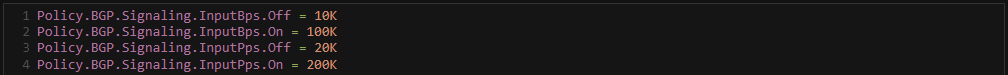 BGP.Signaling.Input{Pps,Bps}.Off, при падении трафика ниже которых изsystem.policy.signaling.prefixesбудут удаляться значения префиксов получателя из правил маршрутизации, ведущих на политику защиты. -
