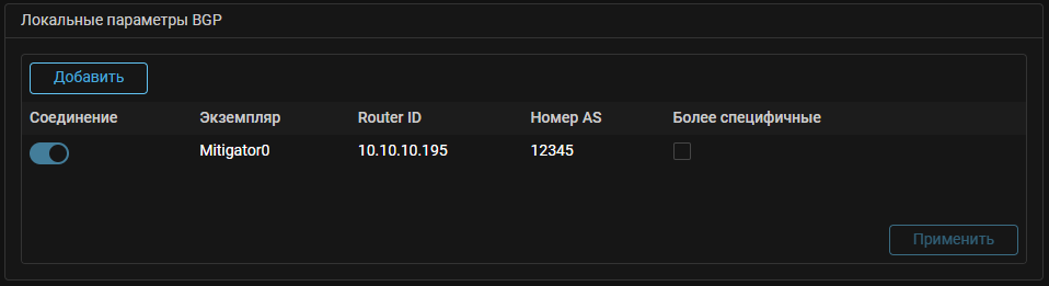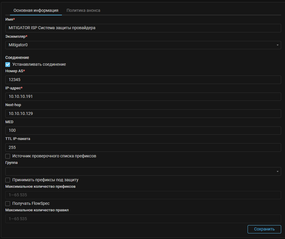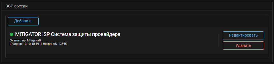 Создать BGP-соседей, которым MITIGATOR ISP будет отправлять BGP-анонсы для перенаправления трафика на себя.