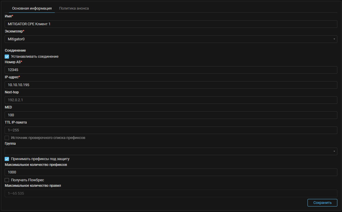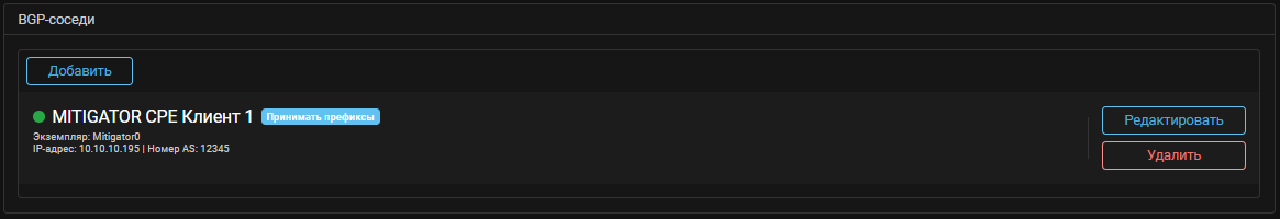 В настройках BGP-соседа указать сетевые параметры MITIGATOR CPE, такие как IP-адрес и номер автономной системы. Установить чекбокс «Принимать префиксы под защиту», при необходимости задать максимально допустимое число префиксов, которое может сообщить MITIGATOR CPE. Остальные параметры опциональны и настраиваются по необходимости. Следует указать большое значение TTL IP-пакета, так как MITIGATOR CPE может находиться на удалении.