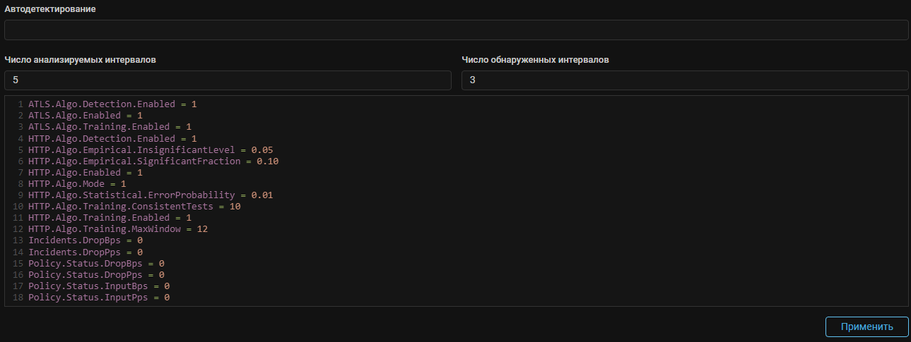 Также через web-интерфейс в рамках политики можно задать параметры автодетектирования «Число анализируемых интервалов» и «Число обнаруженных интервалов», каждый интервал 5 секунд. «Число анализируемых интервалов» — указывает на каком временном периоде смотрятся значения предикатов, а «Число обнаруженных интервалов» — указывает в скольки интервалах должно произойти срабатывание предикатов прежде, чем поменять статус контрмеры. Изменяя эти параметры, можно управлять скоростью реакции и чувствительностью детектирования.