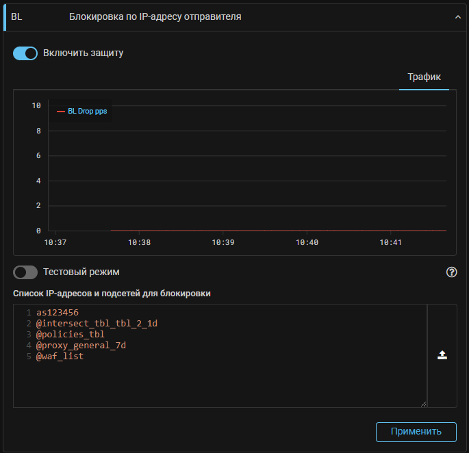 BL позволяет эффективно защищаться от различных атак с помощью сброса всего трафика, поступающего с указанных IP-адресов. Кроме того, может быть удобно сбрасывать трафик IP-адресов по принадлежности к автономным системам. Например, если известно, что на защищаемые ресурсы не должны подключаться IP-адреса хостингов, можно указать в списке номера соответствующих автономных систем.