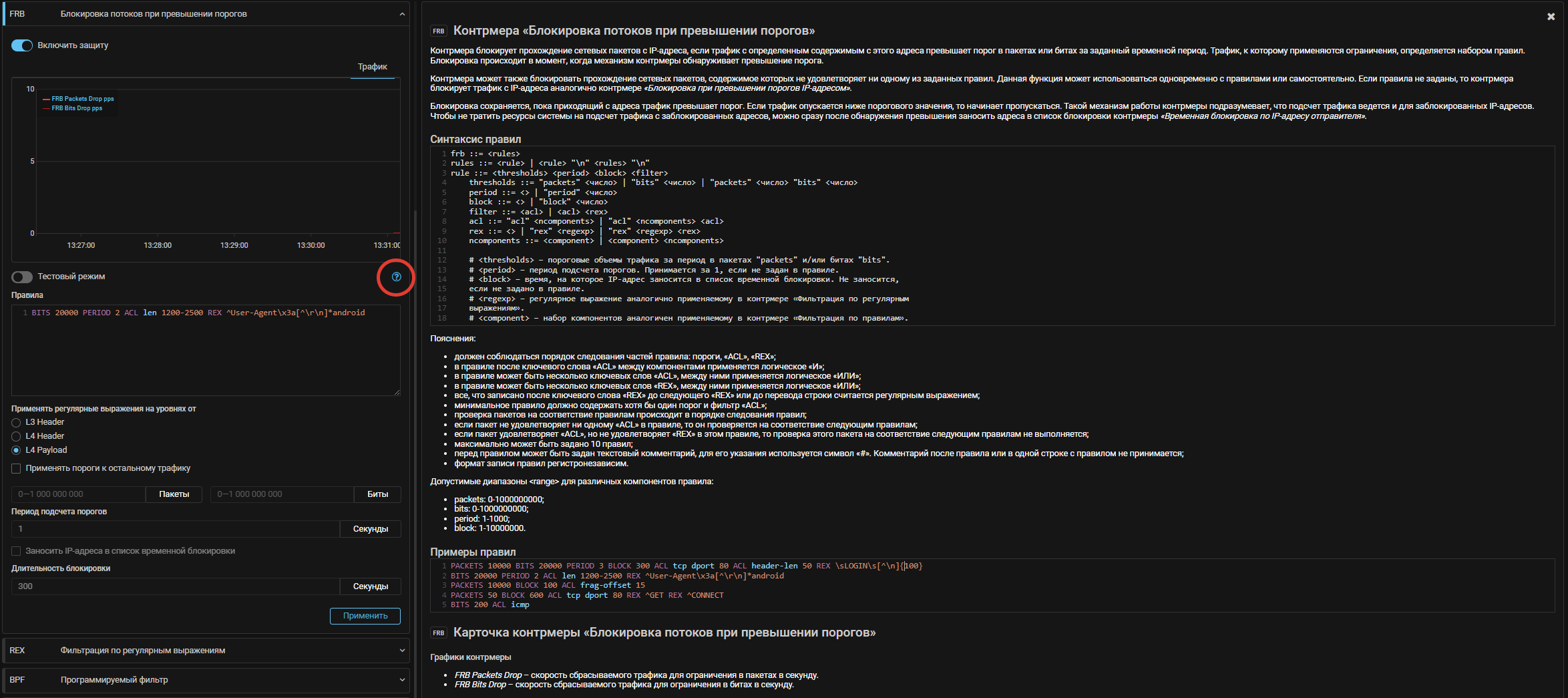 Установить пороги в pps, bps. Активировать чекбокс «Заносить IP-адреса в список временной блокировки».