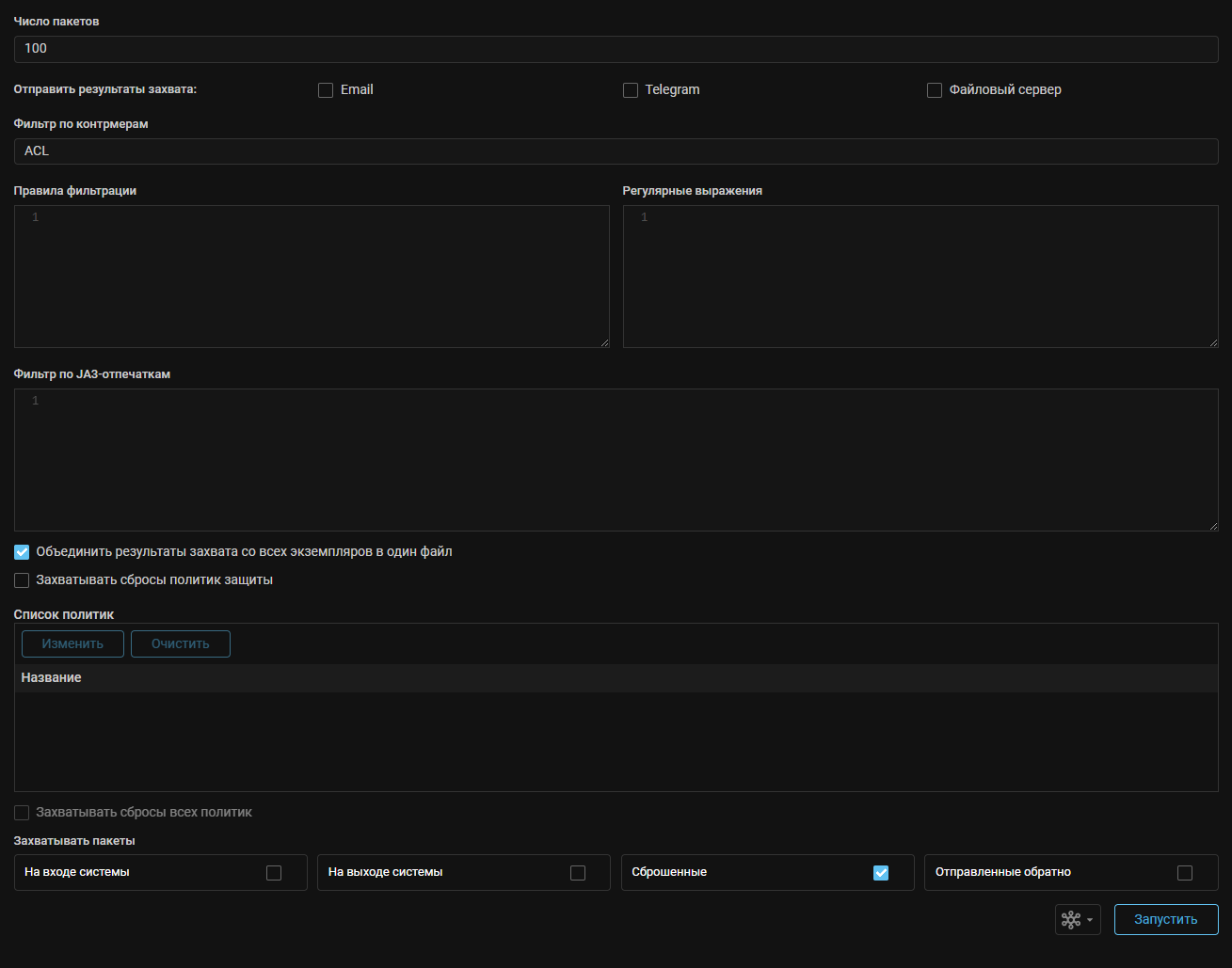 Если ACL сбрасывает пакеты вне атаки, то в карточке захвата пакетов можно захватить сброшенные контрмерой ACL пакеты и произвести более тонкую настройку.