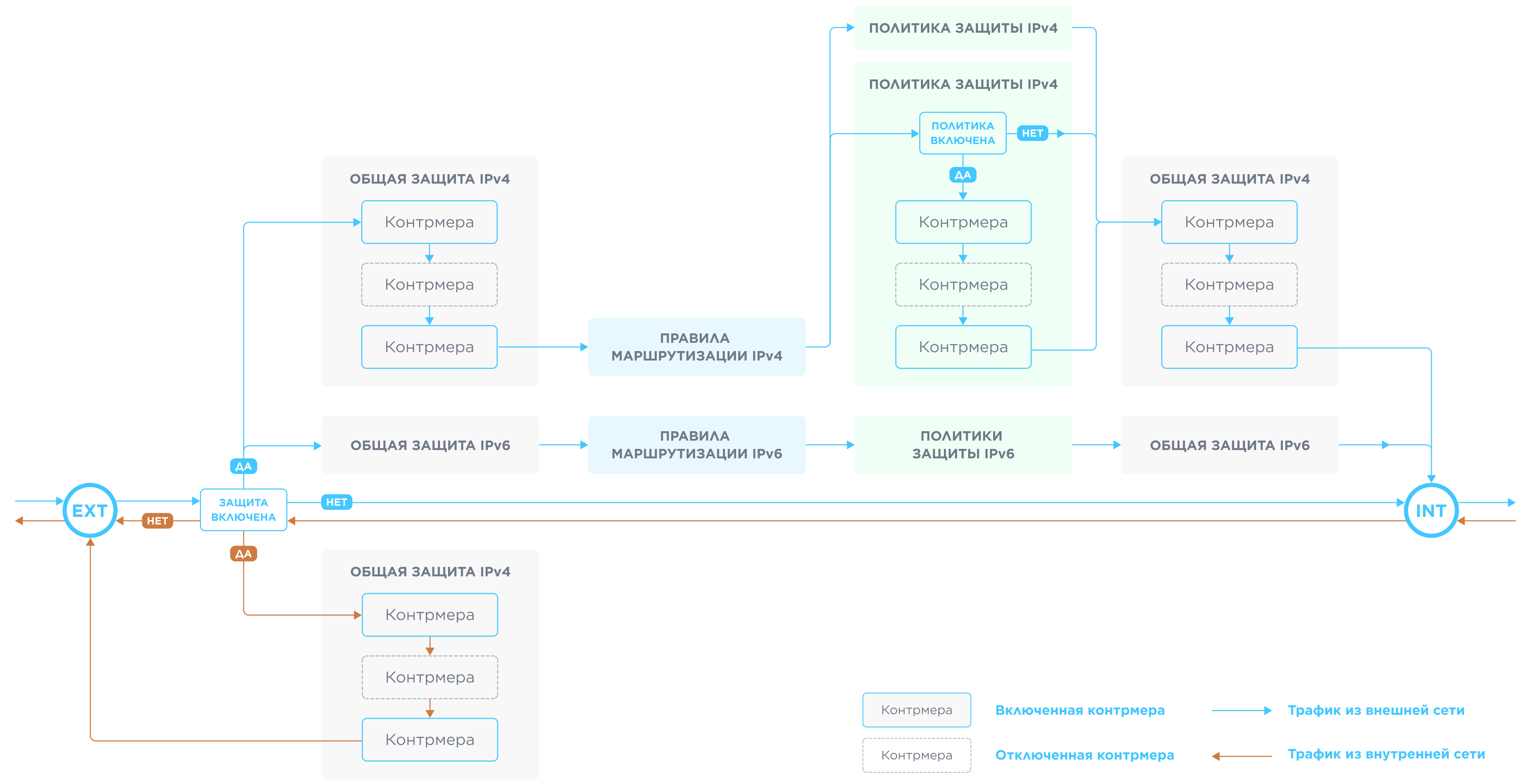 Одна из особенностей MITIGATOR — порядок обработки трафика. Вначале все пакеты обрабатываются в «Общей защите», затем правила маршрутизации по 5-tuple распределяют трафик по политикам защиты, а после политик трафик возвращается в «Общую защиту» на оставшиеся контрмеры.