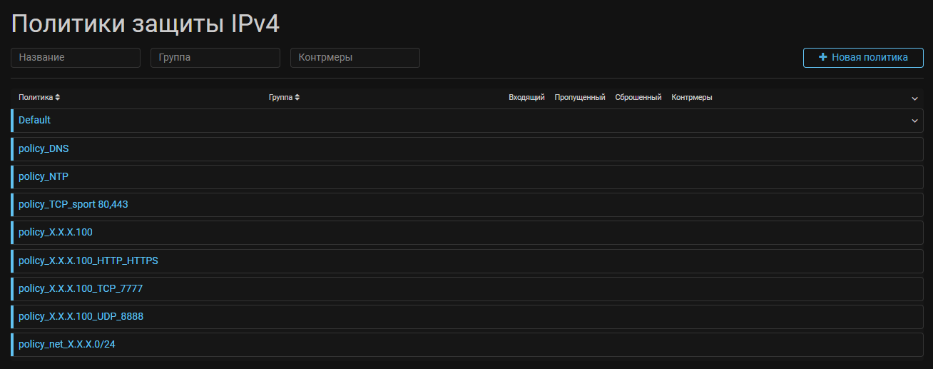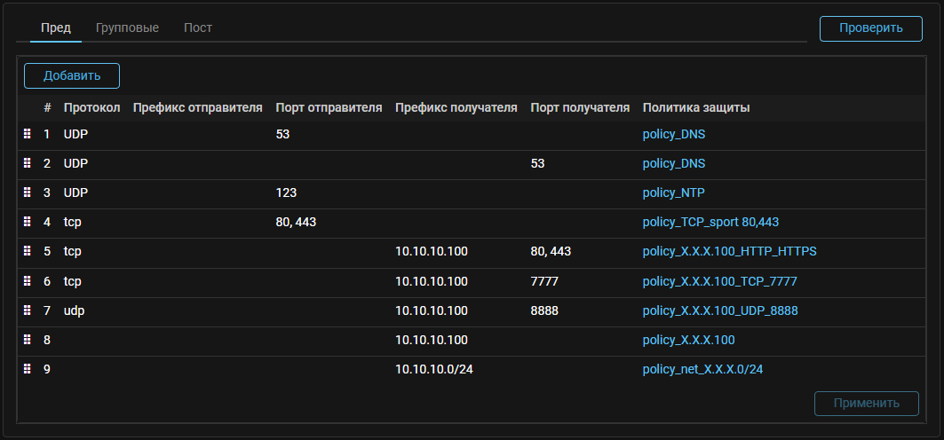9. dst X.X.X.0/24 -> policy_net_X.X.X.0/24Настройка политик защиты