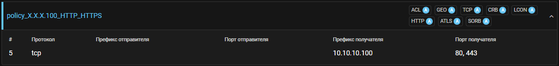 5. tcp dst X.X.X.100 dport 80, 443 -> policy_X.X.X.100_HTTP_HTTPSПравилом 5 отводим трафик web-сервера по адресу X.X.X.100.