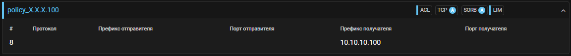 8. dst X.X.X.100 -> policy_X.X.X.100Правилом 8 собираем оставшиеся трафик для хоста X.X.X.100.