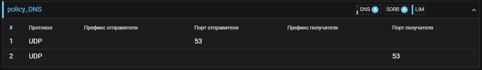 2. udp dport 53 -> policy_DNSПравилами 1,2 мы направили весь DNS трафик сети в одну политику, как запросы, так и ответы. В режиме автодетектирования: DNS, SORB. Включены на постоянной основе: LIM.