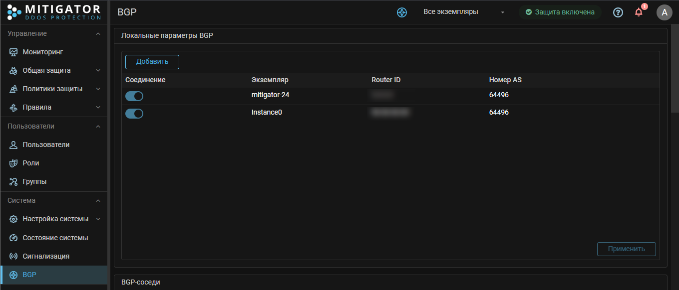 Если в MITIGATOR настроено анонсирование защищаемых префиксов по BGP, то перед обновлением экземпляра следует отключить BGP-соединение для обновляемого экземпляра в карточке «Локальные параметры BGP» на странице «BGP».