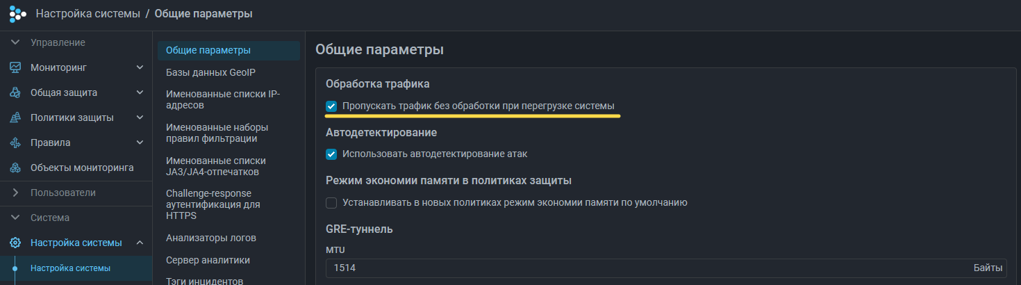 false— дополнительных действий не требуется. Если значение параметра былоtrue— включите пропуск трафика при перегрузке при помощи флага «Пропускать трафик без обработки при перегрузке системы» на странице «Общие параметры» в настройках системы.