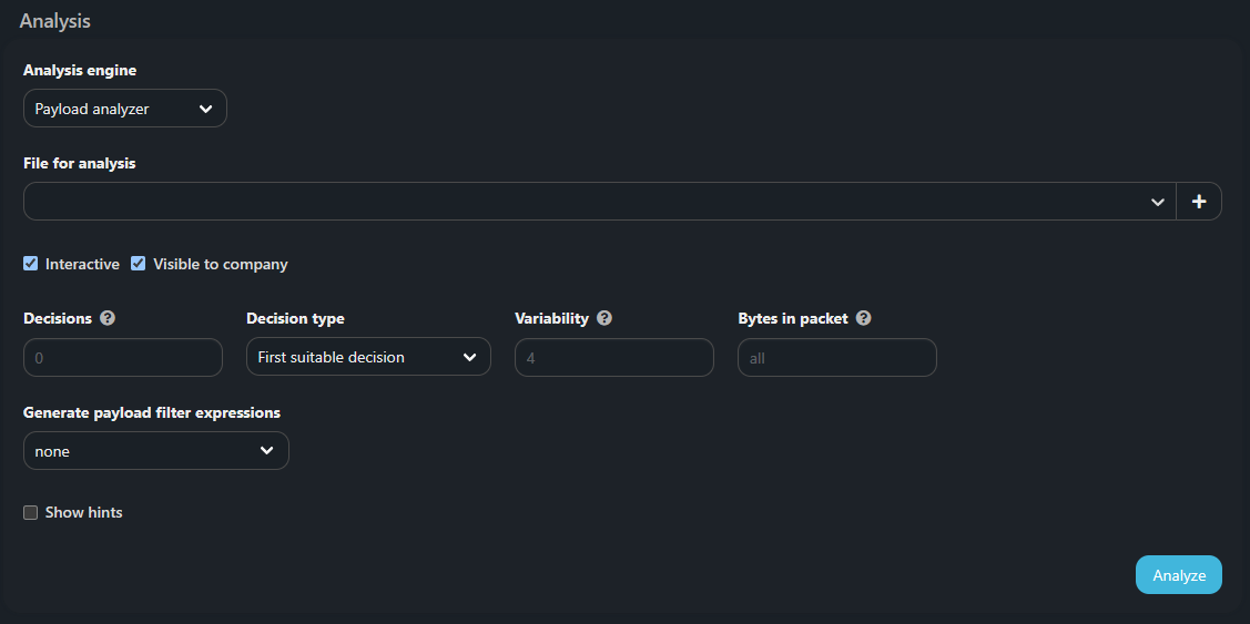 Механизм анализирует L4 payload из дампа и выделяет сигнатуры трафика. Payload Analyzer принимает на вход дампы трафика в форматах PCAP или PCAPNG.