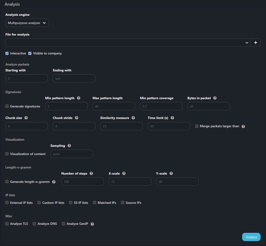 Multipurpose Analyzer анализирует L3/L4 заголовки и L4 payload. На вход принимаются дампы трафика в форматах PCAP или PCAPNG.