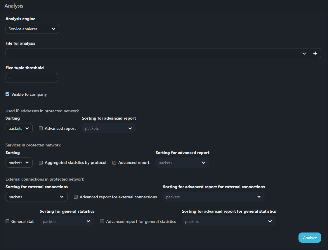 Service Analyzer помогает в первоначальной настройке защиты за счет выявления сервисов в защищаемой сети на основе загруженного дампа. На текущий момент любой загруженный дамп воспринимается механизмом как дамп входящего трафика из внешней сети.