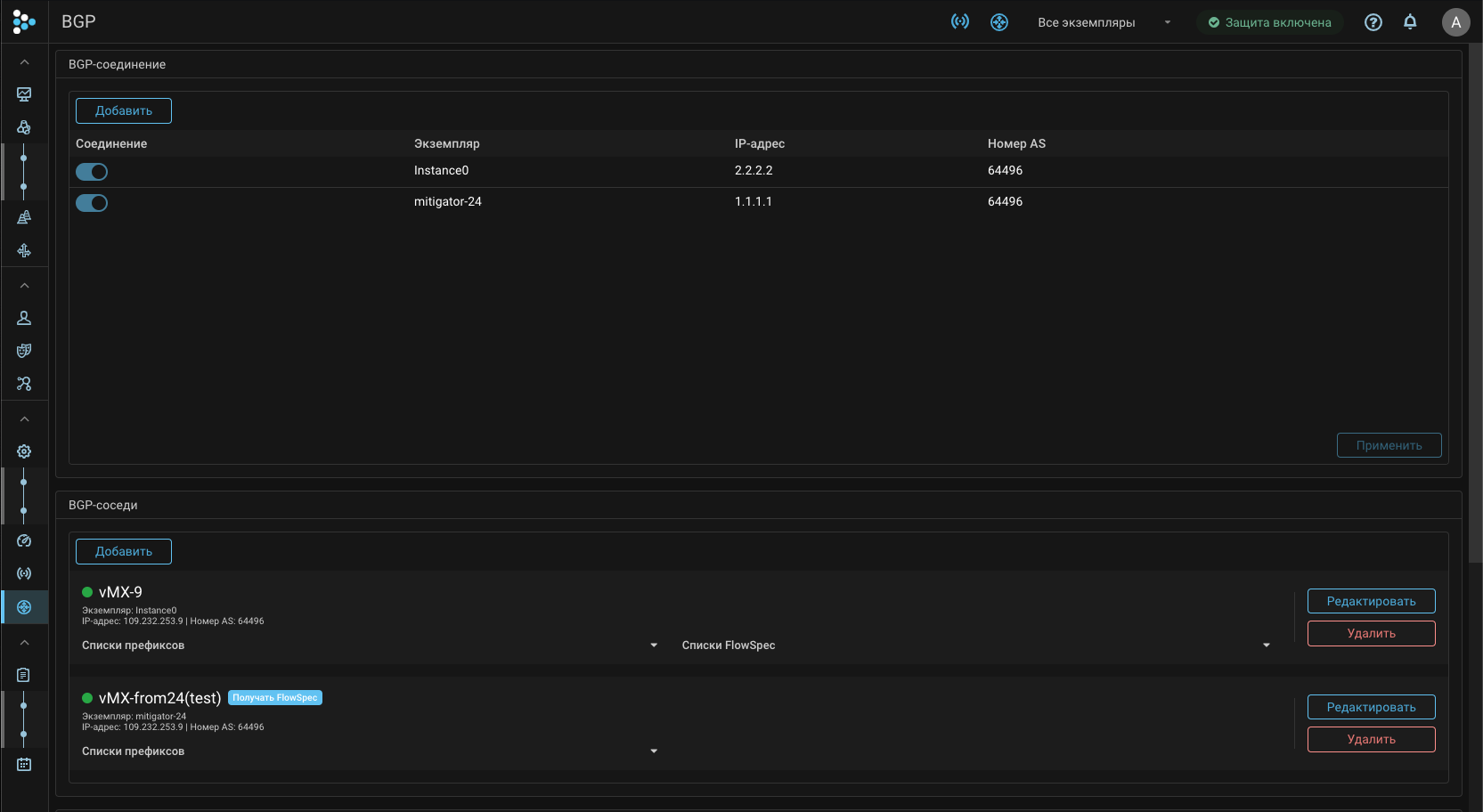 Теперь каждый отдельный экземпляр может устанавливать свои собственные BGP-сессии с независимыми настройками, с общими и отдельными prefix и flowspec листами. Это позволяет организовать различные схемы внедрения и распределения трафика по узлам фильтрации, в том числе когда трафик каких-то сервисов распределяется сразу на несколько узлов, а для других сервисов определен конкретный узел фильтрации.