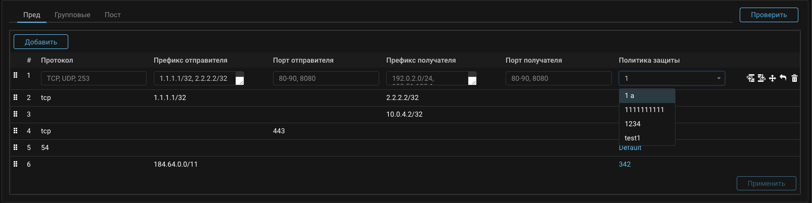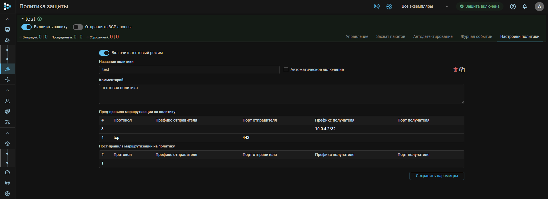 scr IP_testuser dst IP_service -> policy_test_serviceBGP. Добавлена возможность BGP FlowSpec redirect из политики защиты.