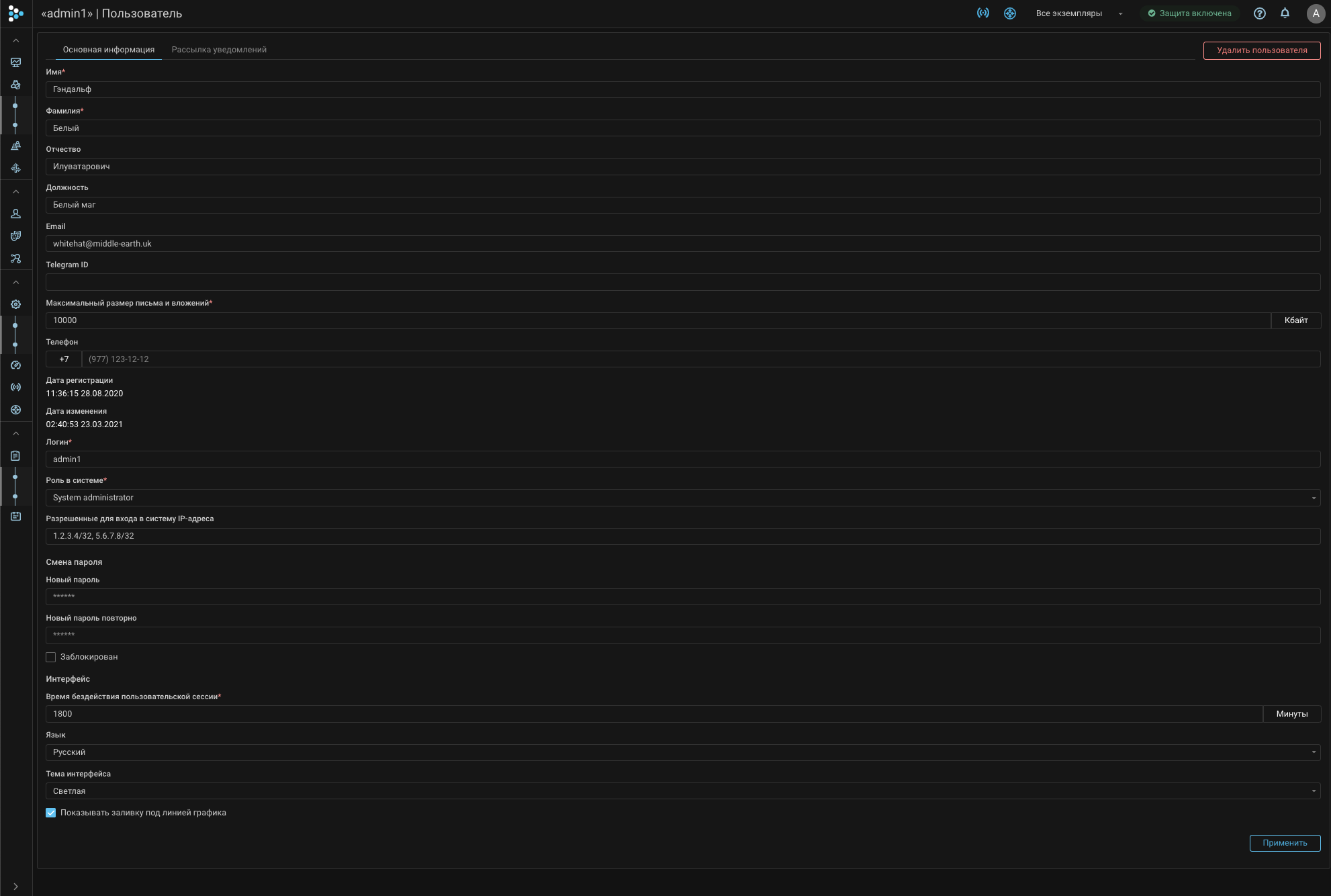 В настройках профиля пользователя можно указать список адресов, с которых разрешен вход в систему. Например, если учетная запись используется для взаимодействия по API c определенных хостов, либо для разрешения работы только с адресов корпоративной сети.