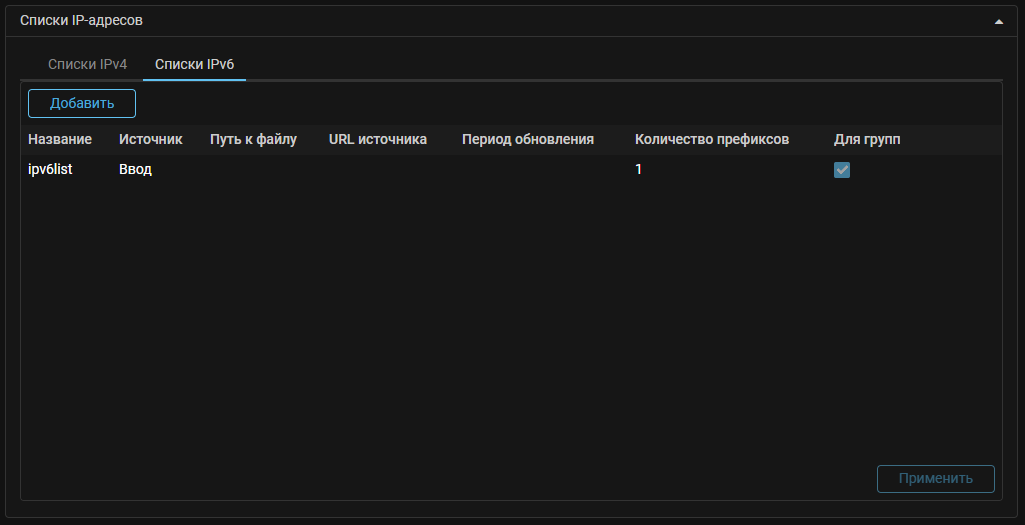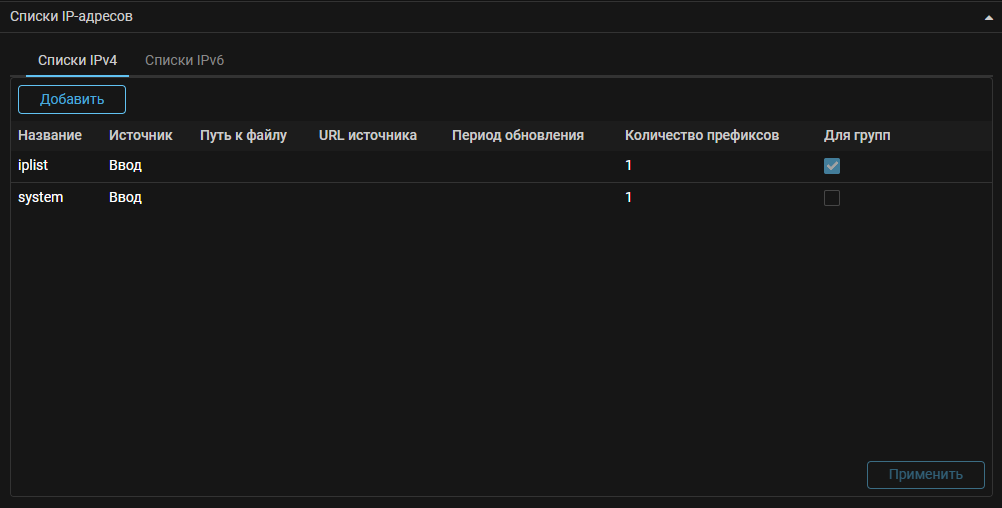 По умолчанию, список IP-адресов доступен только для системных пользователей и может применяться в общей защите и системных политиках защиты. Если установить чекбокс «Для групп», то списком могут воспользоваться групповые пользователи в групповых политиках.
