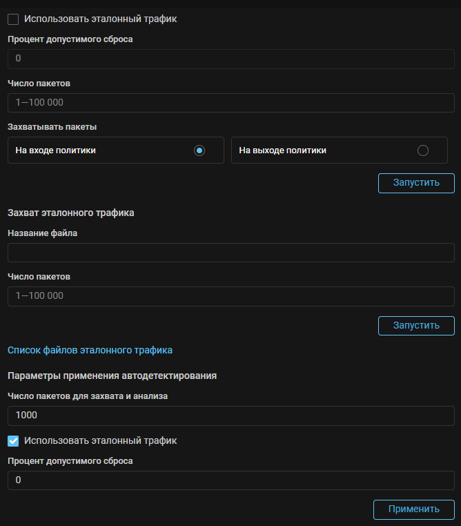 Эталонный трафик – это образец трафика, свойственного для защищаемого сервиса, собранного при отсутствии атаки. Может быть захвачен средствами контрмеры или загружен из файла.