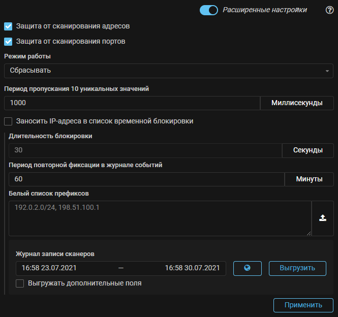 Добавлены новые режимы работы: IP-адреса сканеров теперь могут фиксироваться контрмерой в журнале. Трафик со сканеров может сбрасываться или пропускаться в зависимости от выбранного режима работы контрмеры.