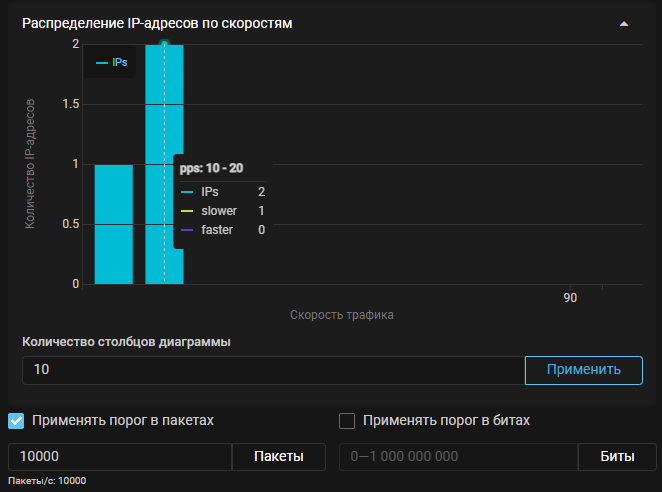 Для подбора пороговых значений в контрмере можно использовать данные из гистограммы распределения IP-адресов по скоростям. Она показывает количество IP-адресов, присылающих трафик с разными скоростями. Это позволяет устанавливать пороги прохождения трафика, опираясь на реальные показатели скоростей, наблюдаемых в текущий момент. При этом можно сразу определить, какое количество IP-адресов будет заблокировано механизмами контрмеры при установке того или иного порогового значения. Гистограмма захватывает данные со входа контрмеры и может строиться даже если контрмера отключена.