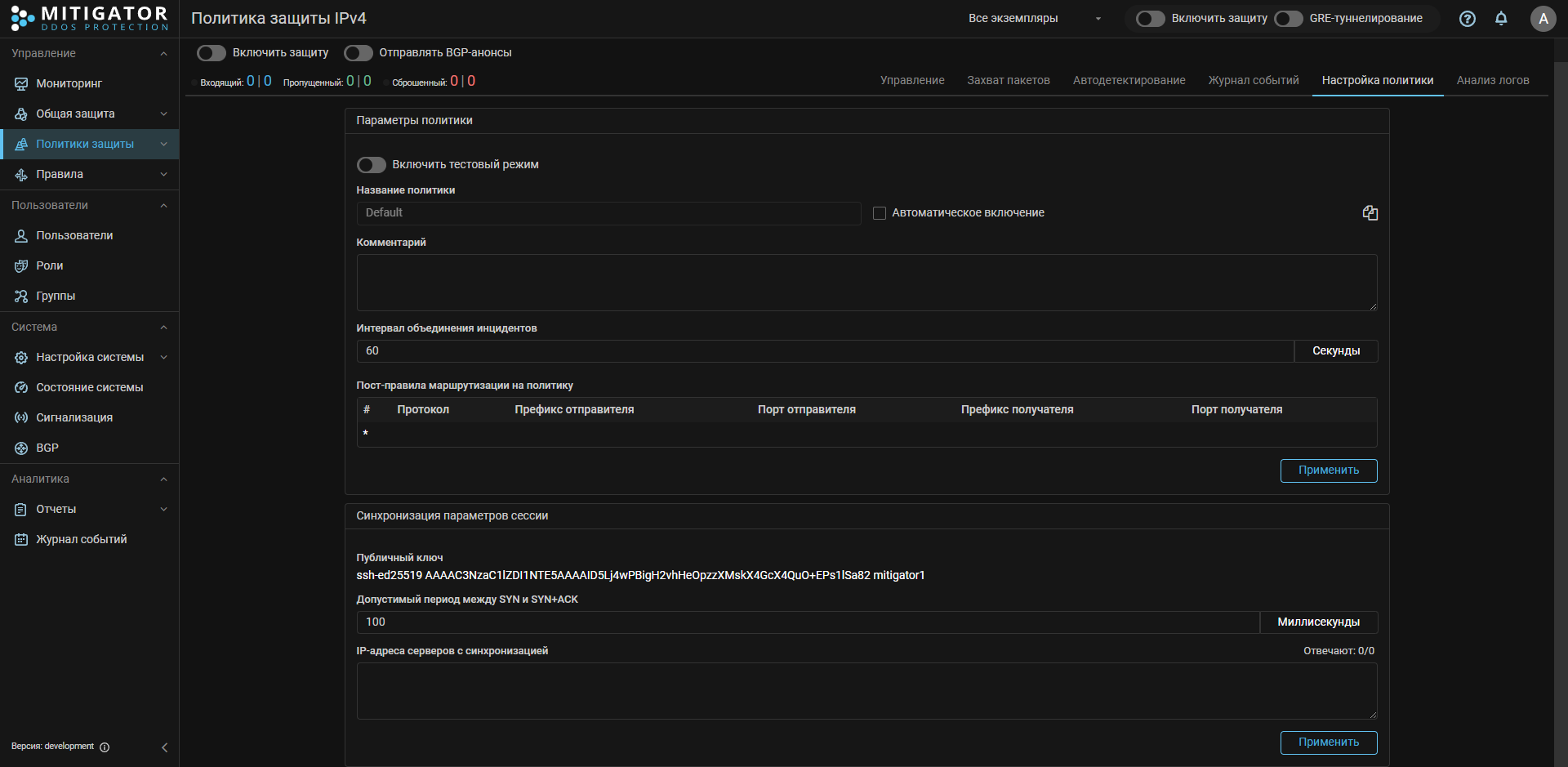 Теперь для всех контрмер политики, поддерживающих работу в режиме синхронизации параметров ISN, применяются единые настройки. Настройки вынесены на вкладку «Настройка политики» страницы «Политика защиты».