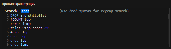 Поля ввода для указания списков значений применяются в системе повсеместно и могут содержать правила, регулярные выражения, префиксы или доменные имена. При работе со списками больших размеров удобно пользоваться горячими клавишами. Чтобы сочетания клавиш сработали требуется, чтобы поле ввода списка значений находилось в фокусе, для чего нужно нажать на него левой кнопкой мыши.