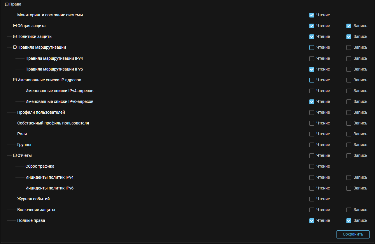 Права на все функции системы разделены на список корневых прав верхнего уровня,