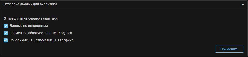 Данные отправляются на сервер статистики для анализа. В будущем из этих данных будут формироваться репутационные списки, доступные для использования в MITIGATOR.