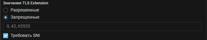 Если установлен чекбокс «Требовать SNI», контрмера ATLS будет сбрасывать все Client Hello без Server Name Indication (SNI) в «Extension». Если выбрано действие «Блокировка отправителя», IP-адрес отправителя будет занесен в список временной блокировки.