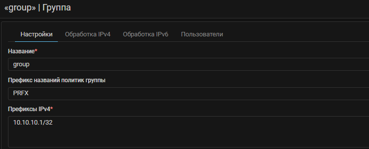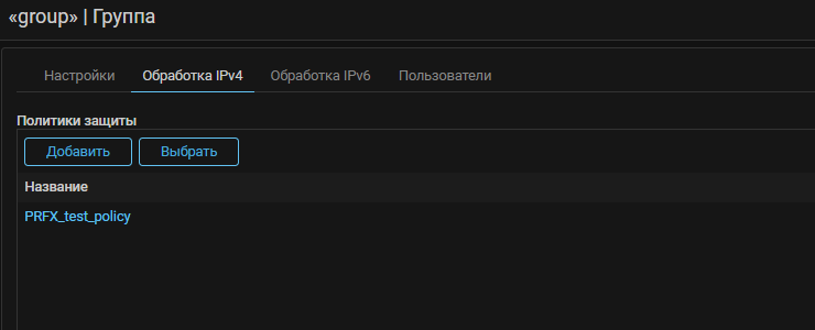 Добавлен префикс названий политик группы, показывающий принадлежность политик защиты к конкретной группе. Префикс автоматически добавляется перед названиями всех политик защиты данной группы через символ нижнего подчеркивания. Это позволяет пользователям разных групп создавать политики с одинаковыми названиями, а администратору системы легко различать политики защиты в общем списке. Поле принимает латиницу, кириллицу, цифры и специальные символы. Максимальная длина – 5 символов.
