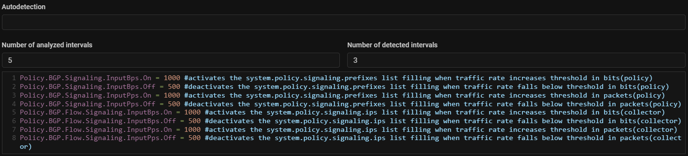 Пороги Policy.BGP.Signaling.Input{Bps, Pps}.{On, Off} управляют формированием системного