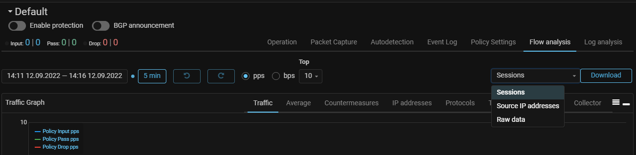 Теперь на вкладке «Анализ Flow» страницы «Политика защиты» можно выгрузить CSV-файлы с данными за указанный временной интервал по сессиям, IP-адресам отправителей или полной информацией в том виде, в котором она хранится на коллекторе.