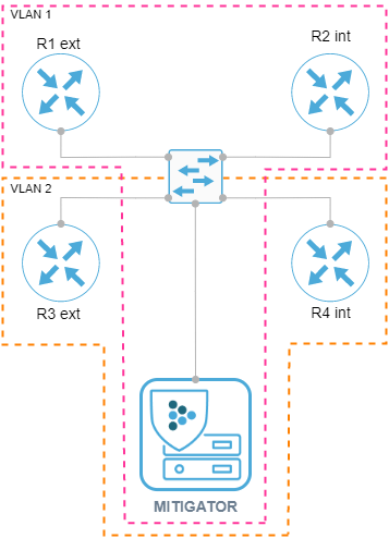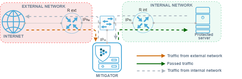 В дополнение к существующим вариантам интеграции в сеть добавлен способ подключения «Common LAN» при работе MITIGATOR в режиме L3-роутер. «Common LAN» следует использовать когда внешний и внутренний роутеры и MITIGATOR находятся в одной L2 и L3 сети. В данном режиме в таблице маршрутизации R ext для защищаемых префиксов указывается nexthop IPm. При этом трафик, исходящий из внутренней сети, может идти как через MITIGATOR, так и напрямую к внешнему роутеру.