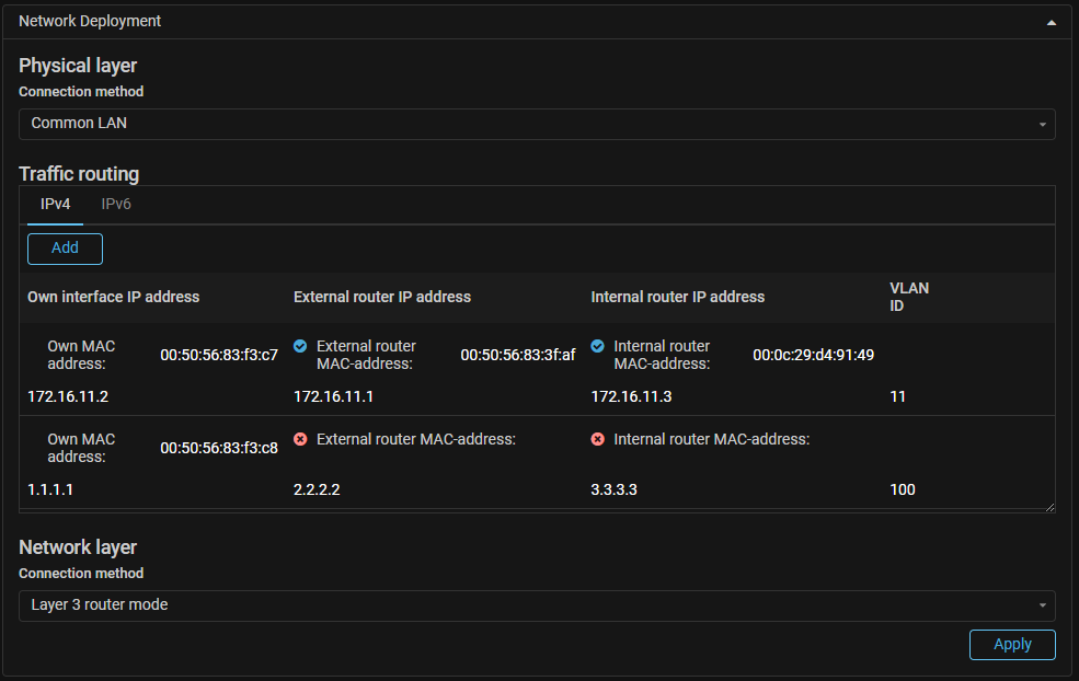 Поддерживается работа в нескольких сегментах сети, разделенных при помощи VLAN. В этом случае для каждого VLAN задаются свои L3 настройки.