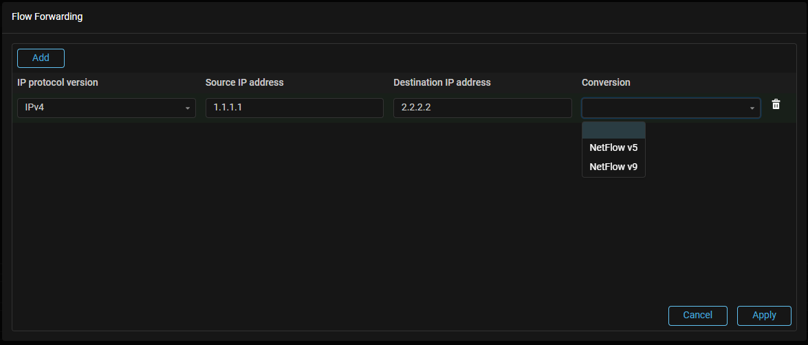 Теперь при пересылке Flow на сторонние коллекторы можно указать, в какой формат он будет конвертироваться. Доступна конвертация в NetFlow пятой и девятой версий.