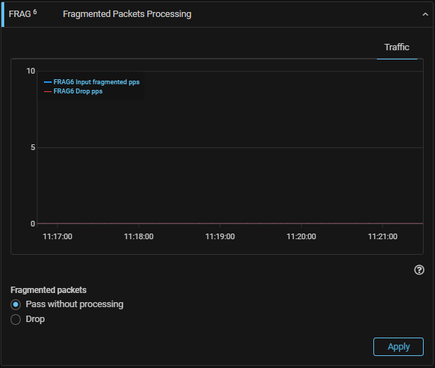 Контрмера включена всегда, когда активирована защита. В отличие от контрмеры в общей защите IPv4, пересборка фрагментированных IP-пакетов не выполняется. Доступны 2 действия для фрагментированных пакетов: сбрасывать или пропускать без обработки.