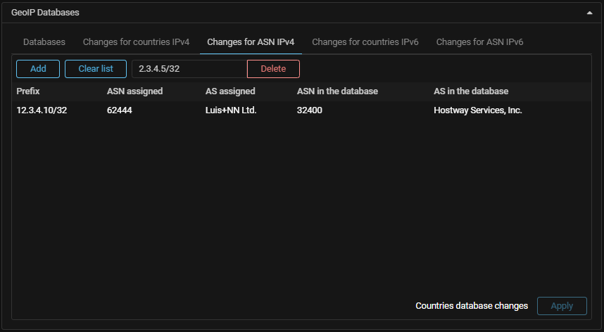 Теперь пользователь может вносить изменения в загруженные базы данных, изменяя принадлежность IPv4 и IPv6 адресов стране и ASN. Вносимые изменения сохраняются при обновлении баз.
