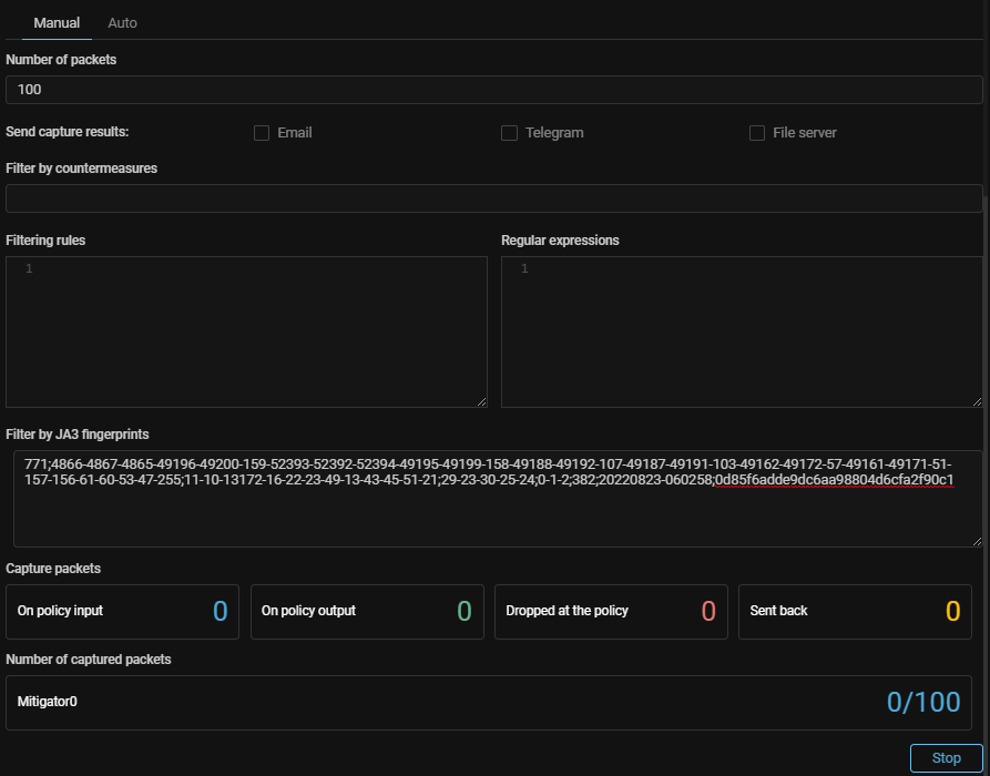 При использовании фильтрации по JA3-отпечатку будут захвачены только пакеты, соответствующие этому отпечатку. Вводимый текст должен содержать значения полей «TLSVersion», «Ciphers», «Extensions», «EllipticCurves» и «EllipticCurvePointFormats», записанные через разделитель: пробел, запятую или точку с запятой, остальные значения игнорируются. Между отпечатками используется разделитель перенос строки. Фильтрация по JA3-отпечаткам выполняется до фильтрации по правилам и регулярным выражениям.