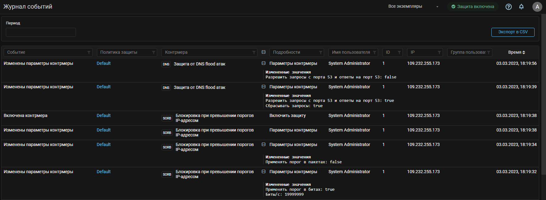 Теперь при внесении изменений в настройки контрмер в поле «Подробности» журнала событий отображаются измененные значения.