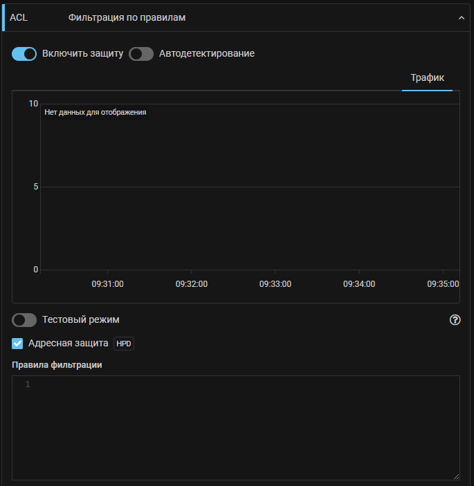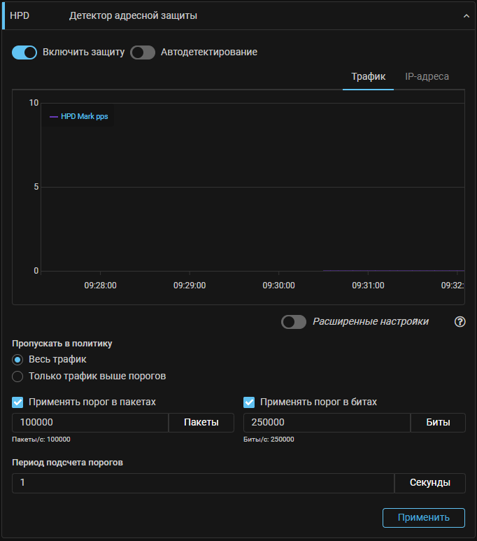 Для ситуации когда в политику защиты направляется трафик множества dst IP и необходимо активировать фильтрацию только для трафика адресов под атакой, добавлен механизм «Детектор адресной защиты» (HPD). Механизм позволяет активировать фильтрацию в отдельных контрмерах только для IP-адресов, трафик на которые превышает установленный порог в пакетах или битах.