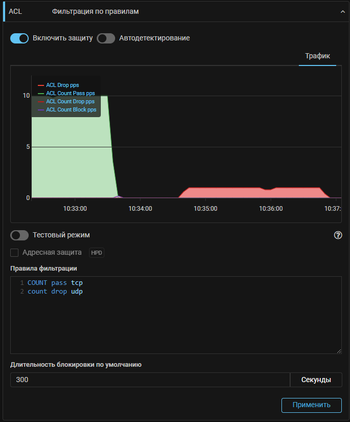 PASS– пропустить;DROP– сбросить;PACKETS<число> – ограничить в пакетах в секунду;BITS<число> – ограничить в битах в секунду;PACKETS<число>BITS<число> – ограничить в пакетах в секунду и битах в секунду.