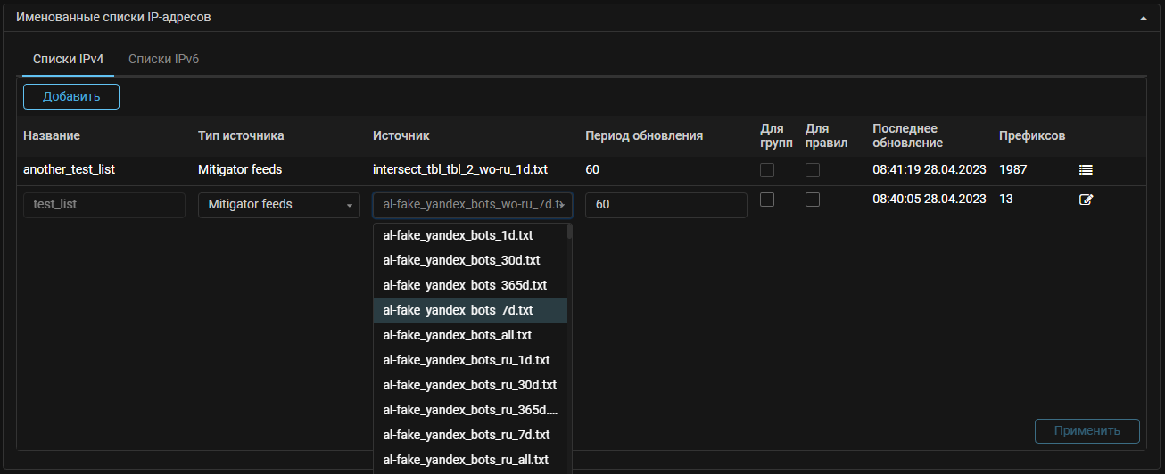 Теперь при создании именованного списка IP-адресов в качестве типа источника можно указать «Mitigator feeds». Выбранный из выпадающего списка фид с сервера аналитики будет установлен в систему. Работает фильтрация по названию. Период обновления списка аналогичен типу источника «HTTP».