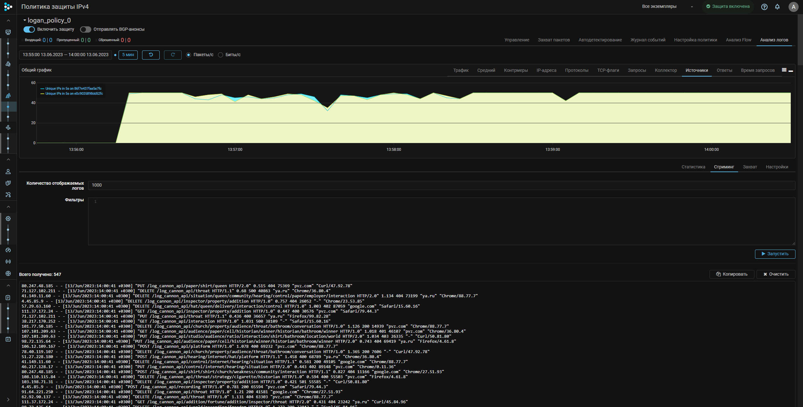 В LOGAN добавлена вкладка «Стриминг». На вкладке отображаются получаемые от Web-сервера логи в реальном времени. Настраивается количество отображаемых записей. При необходимости выдача может быть отфильтрована с применением фильтров по:
